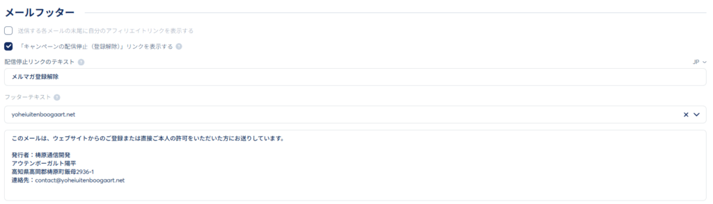 それから、これはSysteme.ioの数少ない注意点なのですが、初期設定を進めるだけでは、メルマガ発行者の情報がメールに記載されないという点です。これは、仕事でメルマガを送るときには「特定電子メール法」で必要とされています。