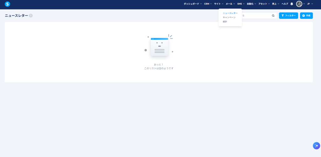 まず、Systeme.ioトップメニュー「メール」セクションの「ニュースレター」をクリック