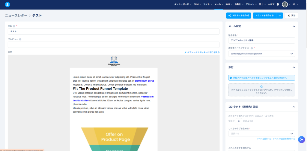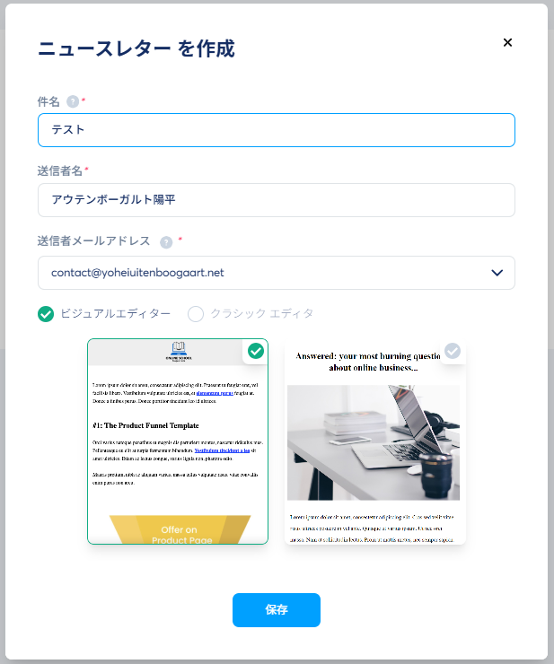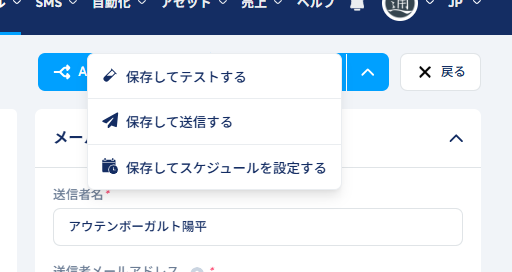 件名に「テスト」と入れ、送信者名と送信者メールアドレスを確認して、保存を押します。