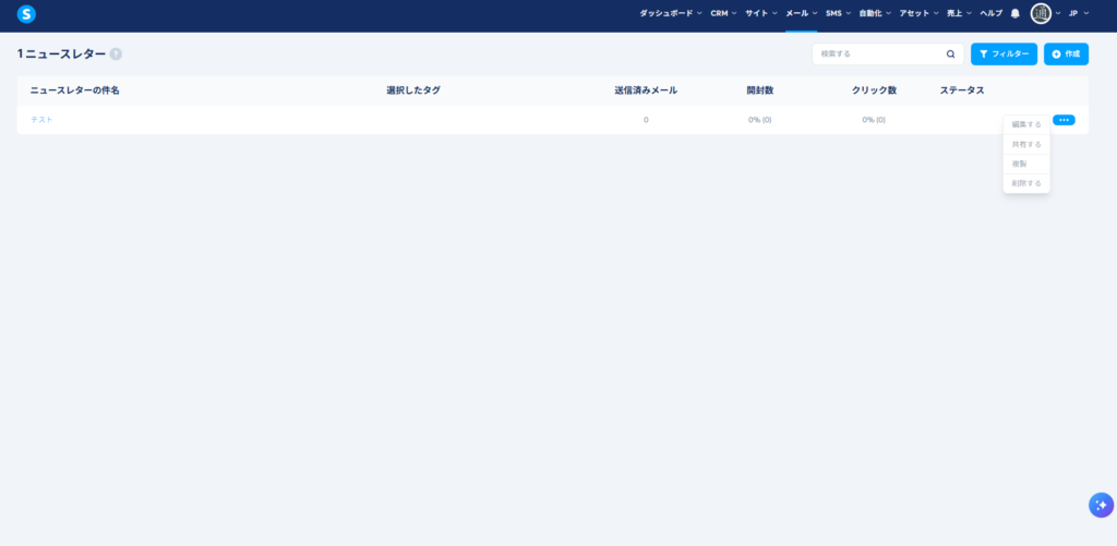 ニュースレター一覧の画面になりますので、先ほど入力した件名「テスト」をクリックして、編集画面に入ります。