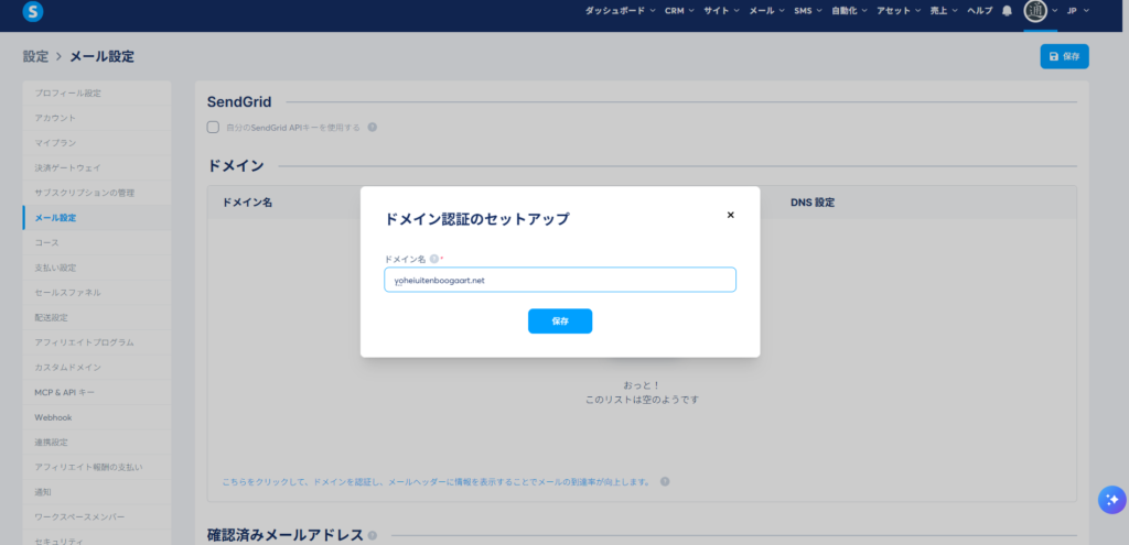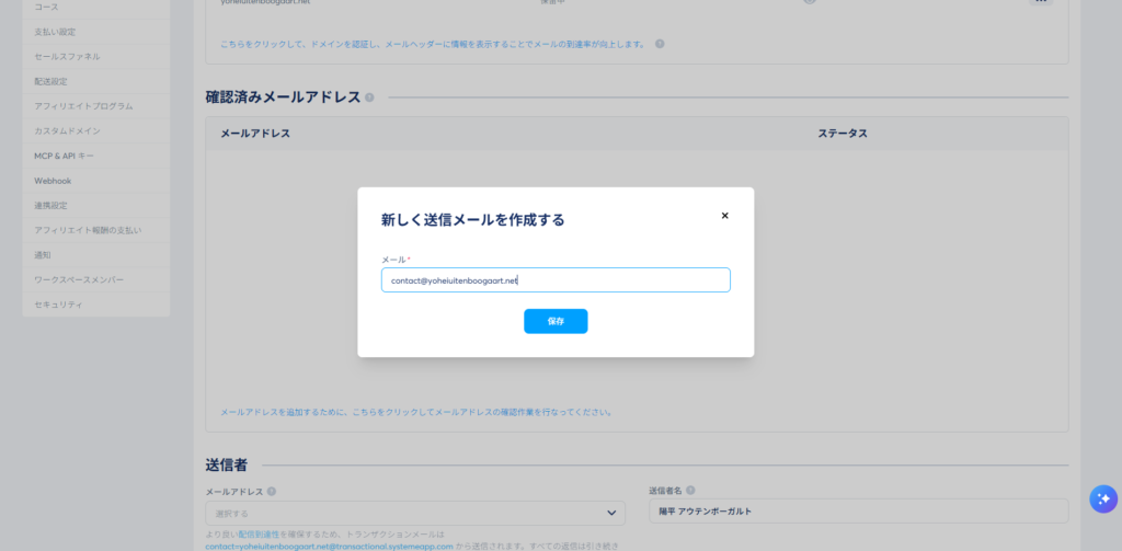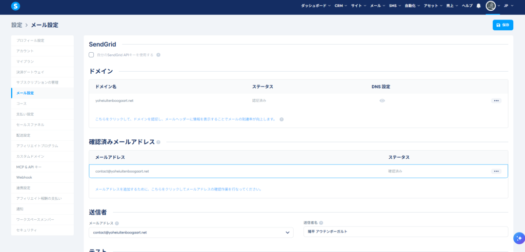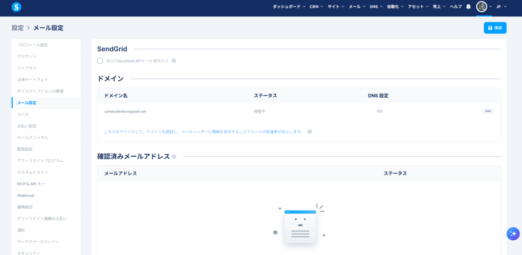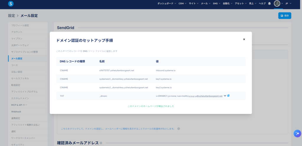 Systeme.ioのメール設定画面に戻って、ステータスの部分が「認証済み」になっていたら、成功です。おめでとうございます!