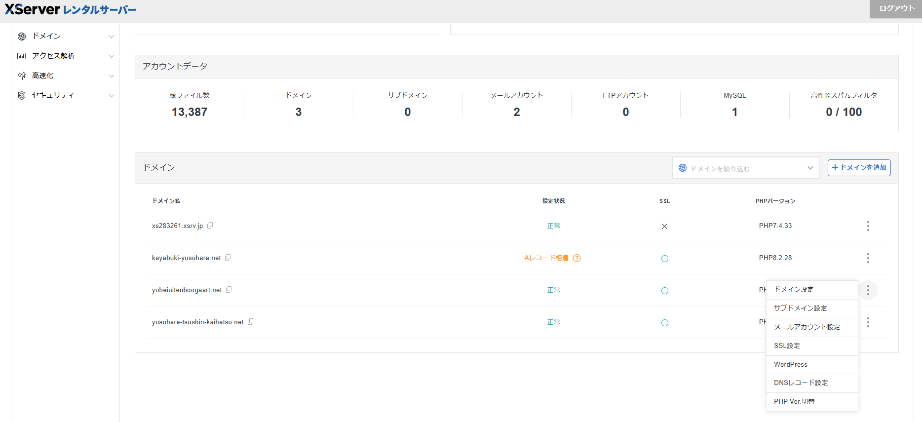 普通にXserverのアカウントにログインしたら、この画面になるんやけど、画面の真ん中のドメインっていうところから入ると、実は間違いなんです。正解は左のメニューの「サーバー管理(サーバーパネル)」から入るのが正解。