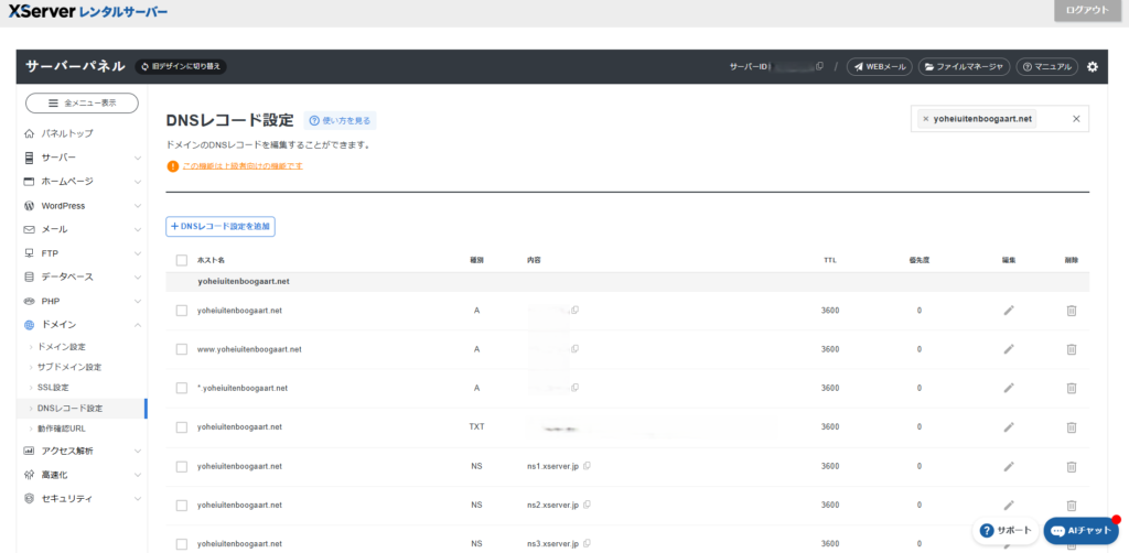 さて、続きをXserverの例で続けます。うまくドメインサーバーにアクセスできたら、DNSレコードの追加に進みます。