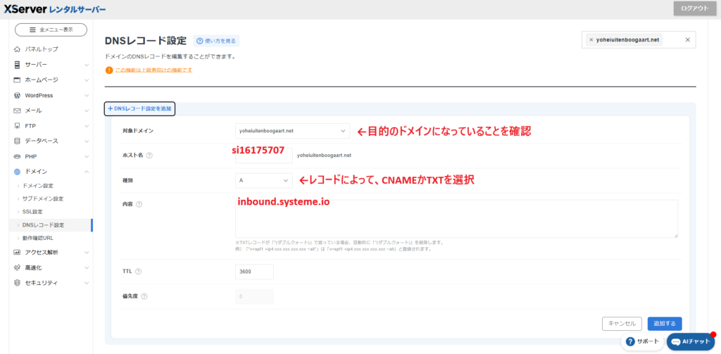 そしたら、DNSレコードを追加する画面になるので、さっきSysteme.ioのメール設定画面で表示した4つのレコードを1つづつ追加していきます。