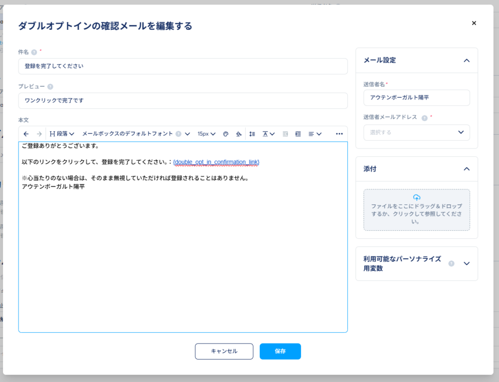 ダブルオプトイン ー メルマガに登録されたときの対応を設定します。