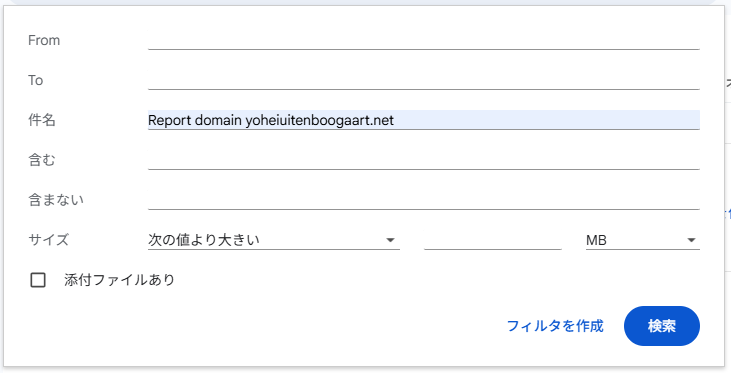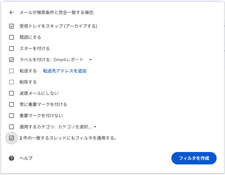 ✅「×件一致するスレッドにもフィルタを適用する」は、既にDmarcレポートが来た後ならチェックを入れ